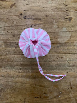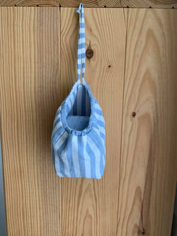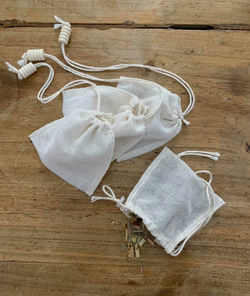 Le sachet est en étamine de coton, le fil est un fil de coton, et la petite perle est en bois traité. Les tissus sont lavés avant confection